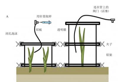 靜態(tài)箱包括可以延伸到土壤或水中的基座和可以蓋住植物并與基座閉合的密閉箱體。箱體一放上去,植物-土壤系統(tǒng)釋放或消耗的氣體將導(dǎo)致箱體內(nèi)氣體濃度發(fā)生變化。通過箱內(nèi)的氣體取樣可以量化氣體濃度的變化。該方法的精確度取決于室內(nèi)空間和釋放CH4的土壤面積之間的比值。與CO2相比,潮汐濕地的CH4排放量通常較低,測定需要覆蓋足夠大的土壤表面(最少是0.25 m2)。可以通過延長測定時間來ᨀ高精確度,但測定時間過長,受陽光照射又會影響箱內(nèi)溫度,進而影響測定結(jié)果。