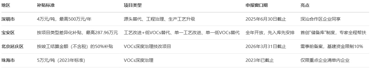2025年3月,深圳市生態(tài)環(huán)境局與財政局聯(lián)合發(fā)布《關(guān)于開展工業(yè)源揮發(fā)性有機(jī)物(VOCs)減排項目補(bǔ)貼工作的通知》(深環(huán)〔2025〕45號),按4萬元/噸的標(biāo)準(zhǔn)對減排量進(jìn)行補(bǔ)貼,單個企業(yè)年度補(bǔ)貼上限達(dá)500萬元。