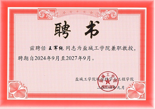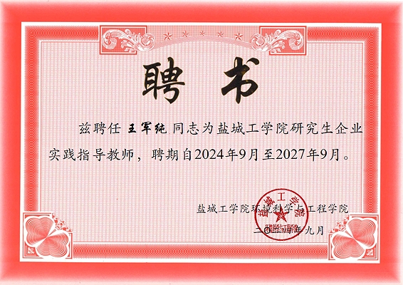 王軍純被聘為鹽城工學(xué)院環(huán)境學(xué)院兼職教授及研究生企業(yè)實(shí)踐指導(dǎo)教師